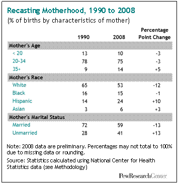 - Marital Status: A record four-in-ten births (41%) were to unmarried women in 2008, including most births to women in their early 20s. In 1990, 28% of births were to unmarried women. The unmarried-mother share of births has increased most sharply for whites and Hispanics, although the highest share is for black women.