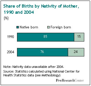 Another influence on births is the nation’s growing number of immigrants, who tend to have higher birth rates than the native born (although those rates have declined in recent years). The share of births to foreign-born mothers, 15% of U.S. births in 1990, has grown at least 60% through 2004. Births to foreign-born women in 2004 accounted for the majority of Hispanic (61%) and Asian (83%) births.
