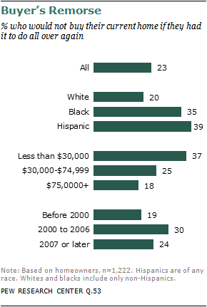 Hispanic and black homeowners have higher levels of buyer’s remorse than do whites. Asked whether, if they had it to do all over again, they would buy their current home, 39% of Hispanics and 35% of blacks say they would not, compared with just 20% of whites.