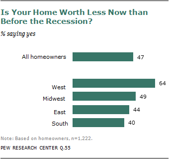 Homeowners in the West are more likely than those in other regions to have seen their homes lose value during the recession. Some 64% of Western homeowners say this, compared with 49% of those in the Midwest, 44% of those in the East and 40% of those in the South.