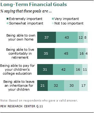 More evidence of the durability of Americans’ belief in homeownership comes from a question in which respondents are asked to assess the importance of four long-term financial goals. Homeownership and “being able to live comfortably in retirement” are rated the highest; each is seen as being extremely or very important by 80% of respondents. Nearly as many (73%) say the same about being able to pay for their children’s college education, and about half (53%) say the same about being able to leave an inheritance for their children. (These percentages do not include those who volunteered a “does not apply” response).