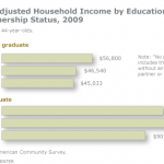 Among college-educated adults, the median adjusted household income of cohabiters ($106,400 in 2009) slightly exceeded that of married adults ($101,160) and was significantly higher than that of adults without opposite-sex partners ($90,067). However, among adults without college degrees, the median adjusted household income of cohabiters ($46,540) was well below that of married couples ($56,800) and was barely higher than that of adults without opposite-sex partners ($45,033).
