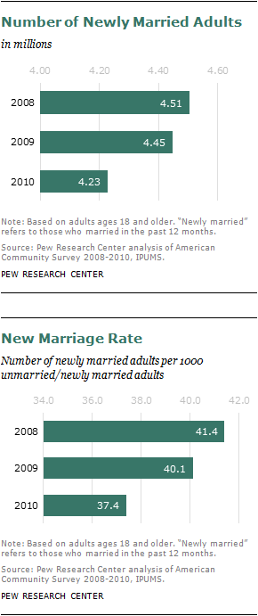 The Pew Research analysis also finds that the number of new marriages in the U.S. declined by 5% between 2009 and 2010, a sharp one-year drop that may or may not be related to the sour economy.
