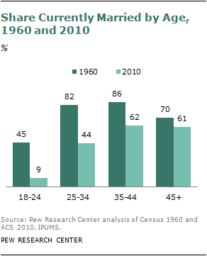 By age group, the decline in the proportion of currently married adults is most dramatic for the young. Only 9% of adults ages 18-24 were married in 2010, compared with 45% in 1960. Among adults ages 25-34, fewer than half (44%) were married in 2010, compared with 82% in 1960. Although most Americans in their mid-30s onward are married, the proportions have declined notably since 1960.