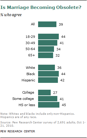 Public opinion about marriage echoes the declining prevalence of marriage. In a 2010 Pew Research Center survey, about four-in-ten Americans (39%) said they agree that marriage as an institution is becoming obsolete. Back in the 70s, only 28% agreed with that premise.11