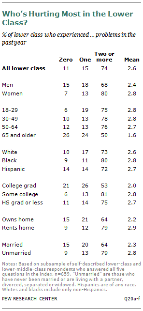 Some demographic groups in the lower class fared differently than others in the past year. Men were twice as likely as women to have faced none of the five problems. Those ages 65 and older were also more than twice as likely as other age groups to have avoided those hardships. Non-college graduates, unmarried adults and renters are also somewhat more likely than college graduates, married adults and homeowners to have had two or more problems in the last two months.