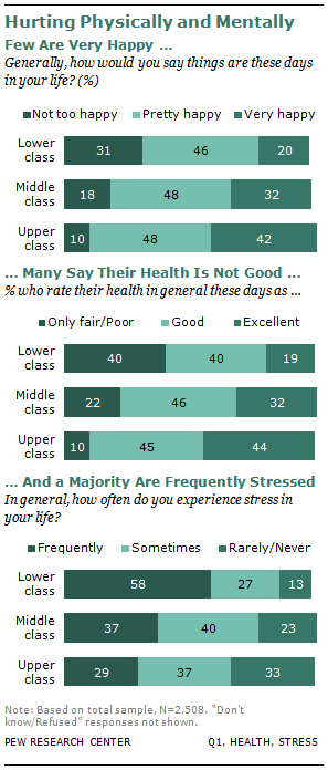 Compared with the upper class, the lower class is four times as likely to be in subpar health, three times as likely to be unhappy and twice as likely to be frequently stressed.