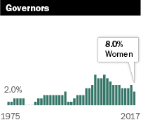 Most Americans say women are about equal to men when it comes to key leadership traits such as intelligence and capacity for innovation, yet women still make up a small share of top leadership jobs. Our 2015 report explored Americans’ views about women leaders, the barriers they face and prospects for the future. Below, we’ve charted the most up-to-date data on the share of women in top U.S. political and business roles over time.
