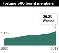 The share of women sitting on the boards of Fortune 500 companies has more than doubled, from 9.6% in 1995 to 20.2% in 2016.