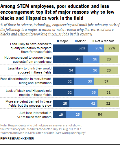 Most blacks in STEM positions consider major underlying reasons for the underrepresentation of blacks and Hispanics in science, technology, engineering and math occupations to be limited access to quality education, discrimination in recruitment and promotions and a lack of encouragement to pursue these jobs from an early age.