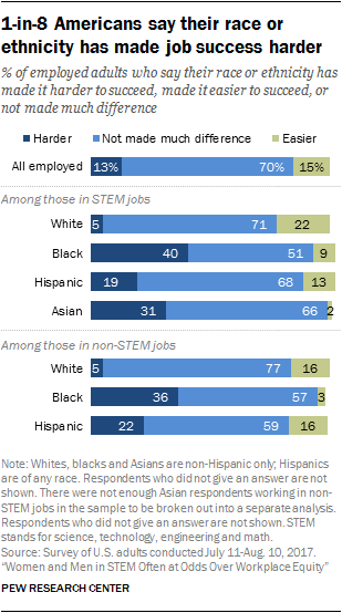 Blacks and Asians in STEM jobs, followed by Hispanics, are more likely than white STEM workers to say that their race or ethnicity has made it harder to find success in their job.
