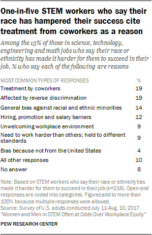 One-in-five STEM workers who say their race has hampered their success point to treatment from coworkers as the reason